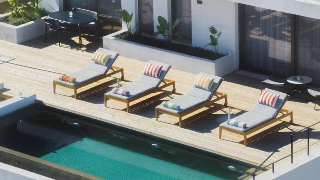 The outdoor area of Hilltop Beach House Villa boasts a stunning 35sqm pool, perfectly integrated into its lavish surroundings. The pool is framed by a beautifully designed wooden deck, providing a warm and inviting atmosphere. Luxurious sunbeds and elegant umbrellas are strategically placed around the pool, offering both comfort and style for relaxation and sunbathing.